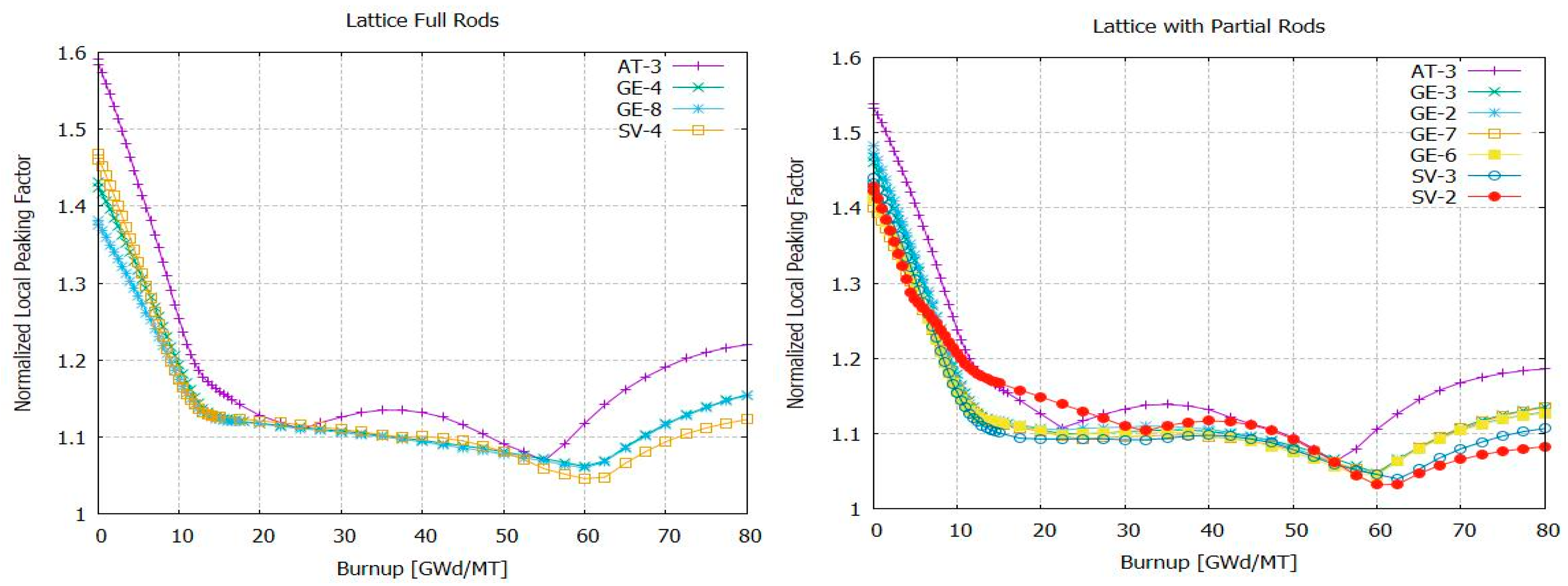 Figure 7 shows this normalized power distribution for cell types AT-2, SV-3, GE-2, and GE-6. SVEA-96 (SV-3) shows a quarter-power distribution fuel assembly symmetry; GE-12 A (GE-2) and B (GE-6) show a half-power distribution fuel assembly symmetry, but they have two different symmetry axes; and finally, the ATRIUM-10 (AT-2) shows a half-power distribution fuel assembly symmetry with one symmetry axis.