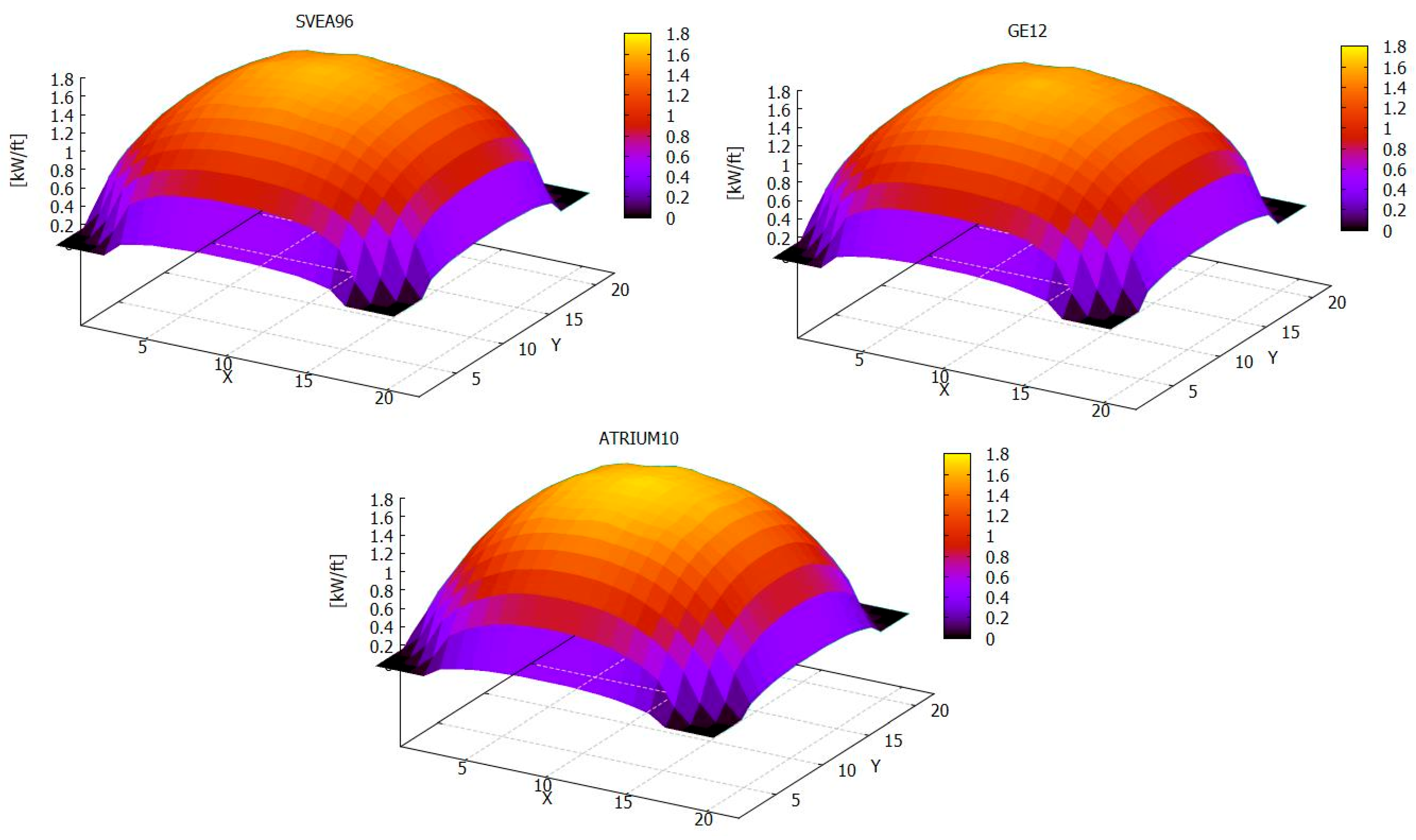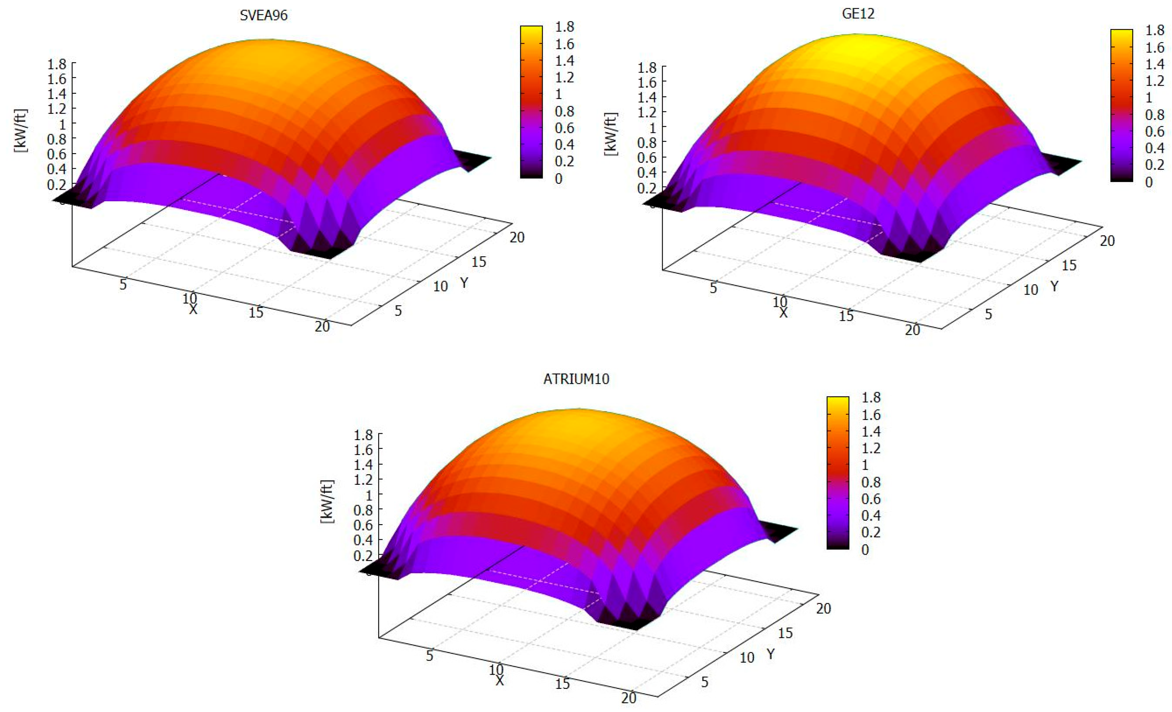 Figure 12 shows it at the end of the cycle. The normalized power goes from 0 to 1.8. The power distribution is homogeneous across all cores, with peaks in the central region not exceeding 1.8; however, at the beginning of the cycle, the SVEA-96 core exhibits the lowest values, followed by the ATRIUM-10 core, and finally the GE-12 core.