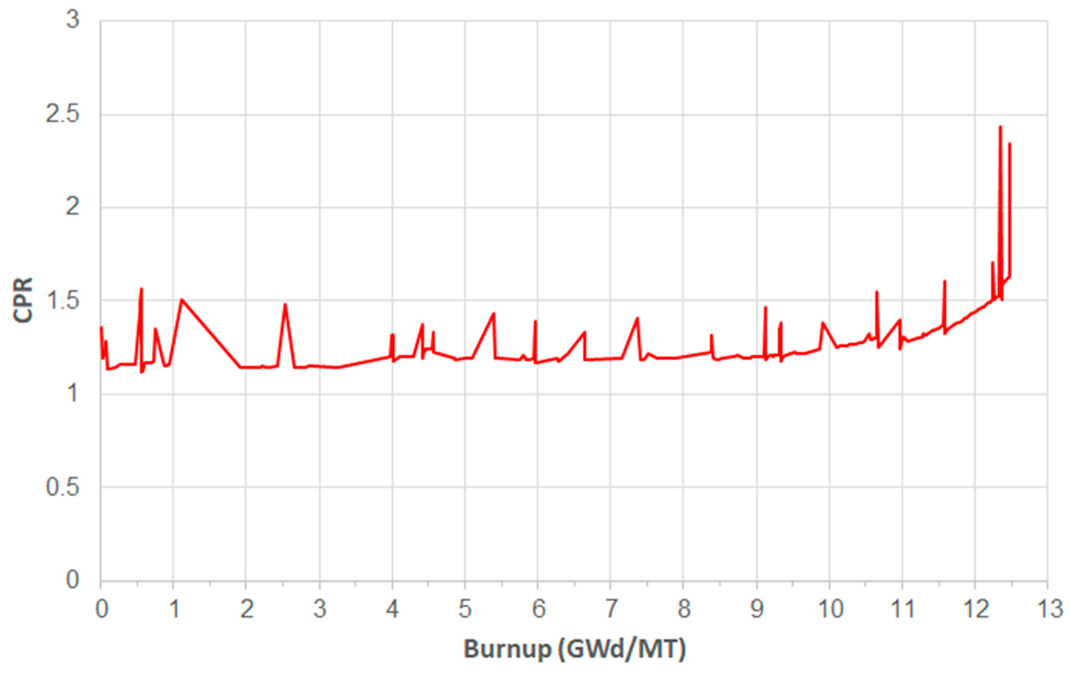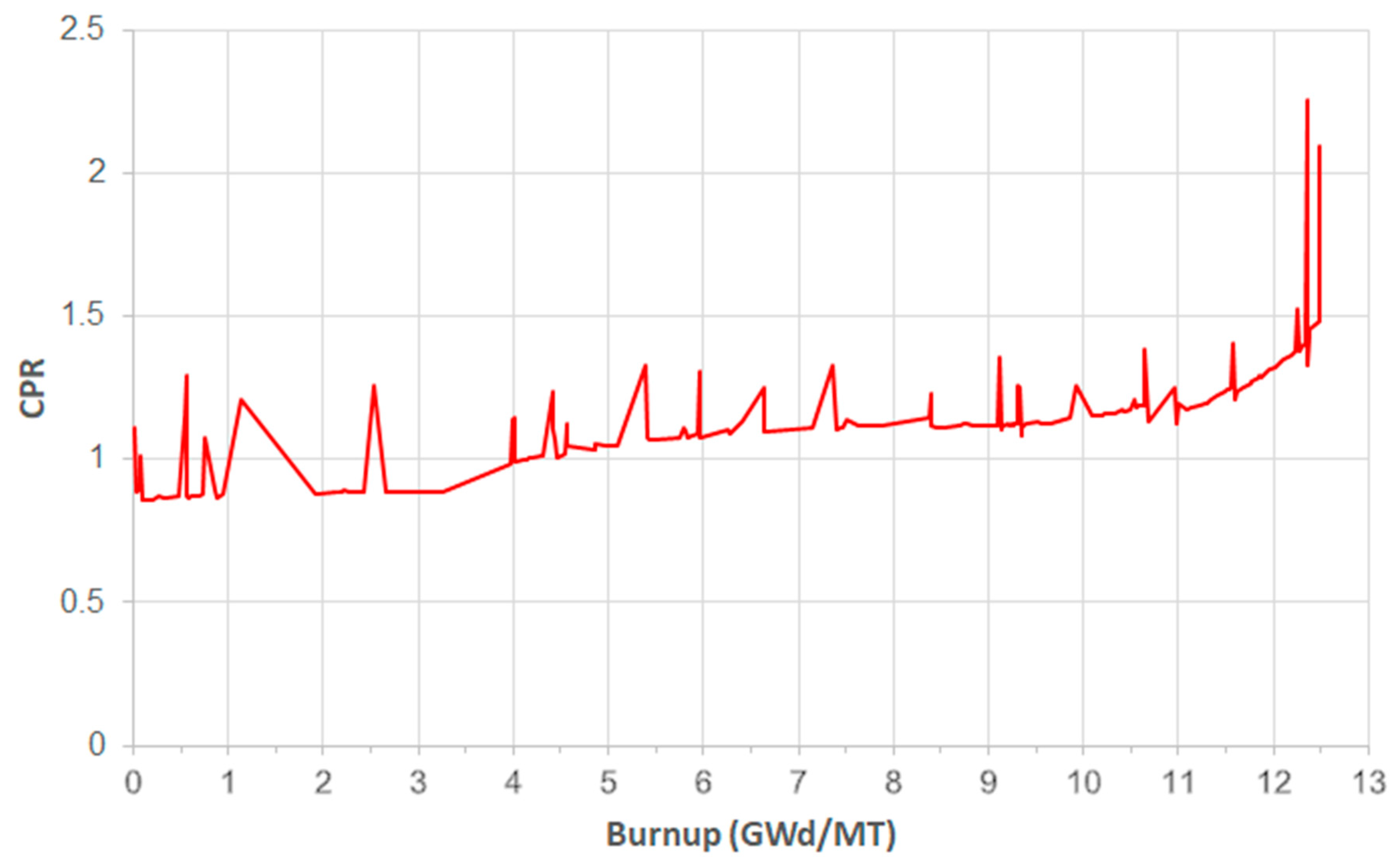 22]. However, the SVEA-96 reactor core has the lowest power distribution, followed by the GE-12 and Atrium-10 cores. At the end of the cycle, ATRIUM-10 will have fuel assemblies with lower burnup and higher reactivity, producing higher power peaks. This behavior of ATRIUM-10 fuel assemblies demonstrates the impact of the symmetric design compared with the other two designs. To validate the adequate performance of these fuel assemblies inside the reactor core, the critical power ratio (CPR) is reported for each fuel assembly design. This safety limit is set to be greater than 1 to ensure that, during the most limiting Anticipated Operational Occurrence (AOO) transient, accounting for uncertainties in monitoring the core operating state, 99.9% of the rods in the core are expected to avoid boiling transition [