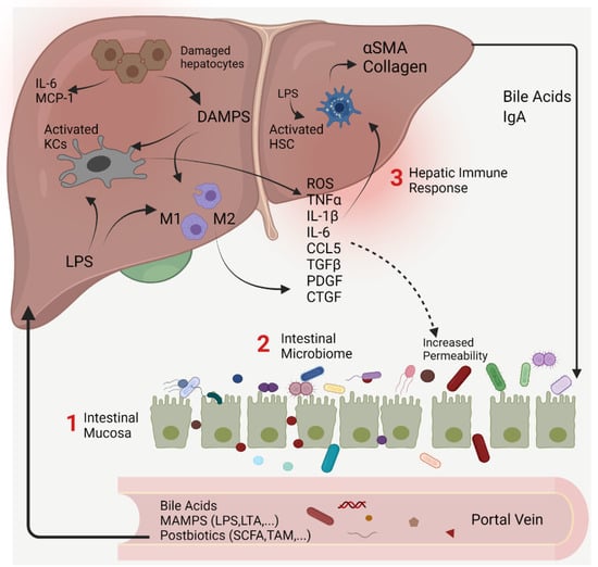 Liver cell populations including Kupffer cells, hepatic stellate cells (HSCs), sinusoidal cells, biliary epithelial cells, and hepatocytes express innate immune receptors known as pattern recognition receptors (PRRs) that respond to the constant influx of microbial-derived ligands from the gut. When translocated MAMPs/PAMPs reach the liver, they bind PRRs including Toll-like receptors (TLRs) to activate immunomodulatory and inflammatory cascades mediated primarily by signal transducer and activator of transcription (STAT) and nuclear factor-kappa B (NF-κB) transcription factors. These effects are beneficial in the short term by limiting pathogen infection and dispersion, yet detrimental over longer periods of activation by stimulating excessive inflammation, fibrosis and organ damage. The many etiologies of CLD affect gastrointestinal homeostasis by causing changes in the microbiome, innate immune defenses and intestinal permeability. Gastrointestinal dysbiosis, particularly in the context of poor diet or excessive alcohol, inevitably exacerbates chronic liver damage, and is a key target to limit inflammatory and fibrotic progression in CLD patients.