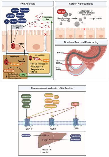 Interventions targeting intestinal mucosa. FXR agonists—In Kupffer cells (KCs) and liver sinusoidal endothelial cells (LSECs), FXR induction leads to the expression of short heterodimeric partner (SHP), and further downregulation of cholesterol 7a-hydroxylase CYP71A. FXR agonists: Cilofexor, CW4064, EDP-305, EYP001a, OCA (Obeticholic acid), PX20606, Tropifexor. Carbon nanoparticles—Non-absorbable carbon particles exhibit a high adsorptive capacity for bacterial-derived products, counteracting bacterial translocation. Duodenal mucosal resurfacing (DMR) is a minimally invasive upper endoscopic procedure that involves circumferential mucosal lifting followed by hydrothermal ablation of duodenal mucosa. Pharmacological modulation of gut peptide agonists of mucosal gut receptor, including GLP-1 agonists, GLP-1/GCG agonists and tri-agonists (GLP1/GCG/GIP), are all intriguing drugs for modulation of fibrosis. Aldafermin (an engineered FGF19 analog), Pegbelfermin (PEGylated human FGF21 analogue) and Efruxifermin (FGF21 mimetic) represent promising targets for modulation of liver fibrosis. GLP-1R, glucagon-like peptide-1 receptor; GCGR, glucagon receptor; GIPR, glucagon-like peptide-1 receptor.