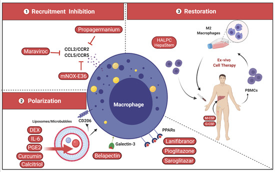 Potential targets of hepatic macrophages to treat liver fibrosis. 1—Inhibition of inflammatory monocyte/macrophage recruitment through the inhibition of CCL2 (MCP-1) by RNA-based silencing (e.g., RNA-aptamer mNOX-E36), small molecule or monoclonal antibody (mAb). 2—Shaping and polarization of hepatic macrophage via biological engineering using nanoparticles or targeting drugs (e.g., dexamethasone [DEX] liposomes/microbubbles) from the pro-inflammatory to regenerative phenotype. 3—Restoration of hepatic macrophage count and function using IL-4 and CX3CL1 [183], macrophage colony stimulating factor (M-CSF) inhibitors or autologous macrophage-based cell therapy. CCL5/CCR5, C-C Chemokine ligand 5/C-C chemokine receptor type 5; CD206, Mannose receptor; HALPC, human allogeneic liver-derived progenitor cells; HepaStem® is an allogenic stem cell therapy product using human adult liver-derived progenitor cells; M2, macrophage type 2; G-CSF, granulocyte colony-stimulating factor; PPARs, peroxisome proliferator-activated receptors.