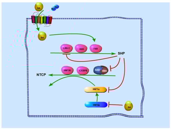 With regard to the substrate feedback, hNTCP expression was downregulated by high levels of bile acids as an adaptive response to block excessive bile acid accumulation in hepatocytes []. Bile acids induce the inhibition of NTCP transcription via activation of the farnesoid X receptor (FXR), a bile acid-activated nuclear receptor. FXR indirectly affects NTCP transport activity, although it does not interact with NTCP promoter []. In hepatocytes, activated FXR promotes the expression of short heterodimer partner (SHP), which in turn blocks the stimulating effect of retinoic acid receptor and retinoid X receptor heterodimers (RAR/RXRs) on the NTCP promoter (Figure 2).