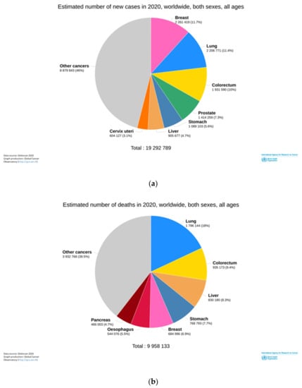 New cases and deaths estimated worldwide in both sexes and all ages related to cancer []. (a) Estimate number of new cases. (b) Estimate number of deaths. Data Source: GLOBOCAN 2020. Graph Production: International Agency for Research on Cancer (IARC) (https://gco.iarc.fr/today/home), World Health Organization. It was accessed on 19 June 2021.