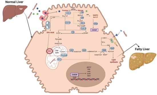 - Lim, J.S.; Mietus-Snyder, M.; Valente, A.; Schwarz, J.M.; Lustig, R.H. The role of fructose in the pathogenesis of NAFLD and the metabolic syndrome. Nat. Rev. Gastroenterol. Hepatol. 2010, 7, 251–264. [Google Scholar] [CrossRef]