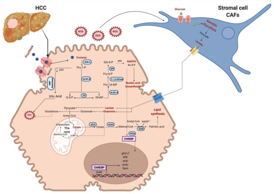 Some studies have reported that in cancer cells, fructose metabolism is decreased compared to normal cells. Furthermore, some enzymes related to fructose catabolism have lower activity in HCC compared to normal liver tissue [,,]. As a result of this metabolism, reprogramming that favors the Warburg effect has been reported []. The canonical Warburg effect is based on reducing mitochondrial oxidation of Pyruvate and the enhancement of glycolysis to obtain higher levels of Lactate and ATP. Lactate is involved in microenvironment reprogramming, angiogenesis, and invasion []. However, because the fructose metabolism generates higher ROS levels, it has been proposed that cancer cells under high fructose levels change their metabolism to a reverse Warburg effect [].