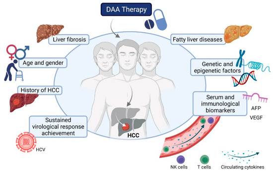 In line with these findings, it is important to classify chronically HCV infected patients as being at risk for HCC development and to implement efficient follow-ups for them after HCV eradication. Predictive factors and specific circulating biomarkers for risk of development of HCC after DAA treatment are greatly needed, to improve the clinical management of chronic HCV patients prior to HCC development. The combination of clinical, biological, genetic, and immune predictors will lead to improved HCC risk stratification.