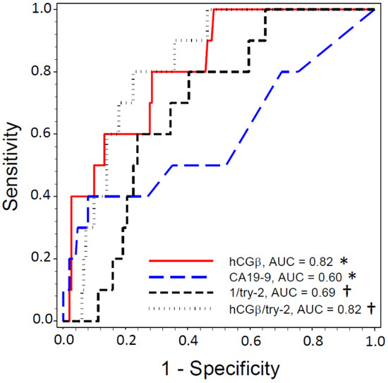 ROC curve analysis for identification of PSC patients developing biliary neoplasia. Ability of serum CA19-9 and biliary hCGβ, trypsin(ogen)-2 (try-2) and the ratio between hCGβ and try-2 (hCGβ/try-2) to identify PCS patients who developed neoplasia (i.e., in whom CCA was diagnosed during the follow-up or in whom biliary dysplasia documented twice or more often (n = 10)). Only PSC patients from whom the levels of all markers were available are included (n = 161). As trypsin(ogen)-2 levels were lower in patients developing biliary neoplasia, the reciprocal was used for ROC analyses. *, †, p < 0.05 in comparison of AUCs (paired analysis).