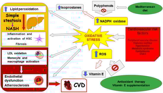 Increased OS, as previously reported, represents a pathophysiological condition commonly reported in NAFLD. The same imbalance is observed in numerous chronic diseases often associated with NAFLD, such as arteriosclerosis [20], hypercholesterolemia [97], obesity [98], metabolic syndrome [99], and obstructive sleep apnea syndrome [100]; all these conditions are—in turn—associated with an increased cardiovascular risk. In fact, on the one hand, an excessive production of ROS is responsible for low-density lipoprotein (LDL) oxidation, which promotes the transformation of macrophages into foam cells, i.e., the process that represents the first phase of the development of the arteriosclerotic lesion. On the other hand, the liver peroxidation of lipids by ROS can induce inflammation and fibrosis by activation of the HSC compartment [101].