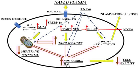 Mechanisms of damage elicited by NAFLD plasma on hepatocytes. ERK: extracellular signal-regulated kinases; FXR: farnesoid X receptor; HSC: hepatic stellate cells; MAPK: mitogen-activated protein kinase; ROS: reactive oxygen species; MitoROS: mitochondrial ROS; H2O2: hydrogen peroxide; NF-kB: nuclear factor kappa-light-chain-enhancer of activated B cells; NLRP3: NOD-LRR-and pyrin domain-containing protein 3; MCC950: a specific, small-molecule inhibitor of NLRP3 inflammasome; NOX: nicotinamide adenine dinucleotide phosphate (NADPH) oxidases; Akt: Ak strain transforming factor; PPAR: peroxisome proliferator activating ligand receptors; SREBP: sterol regulatory element binding protein; TLR: toll-like receptor; TNF: tumor necrosis factor; JNK: c-Jun N-terminal kinase.