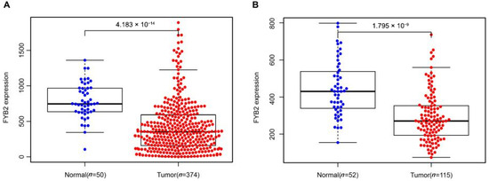 The figures of “The gene expression profiles of all tumor samples and matched normal tissues” provided by GEPIA (http://gepia.cancer-pku.cn/index.html (accessed on 19 December 2020)) are not only used to display the distribution differences of FYB2 in different cancer types but also in normal and tumor tissues.