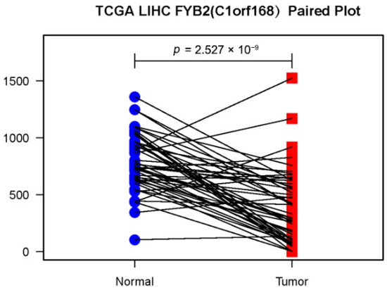At first, we used RNA-seq data in the TCGA LIHC dataset (50 normal samples and 374 tumors samples) and GEO GSE76427dataset (52 normal samples and 115 tumor samples) to analyze the difference in expression of FYB2 between normal and tumor tissues (Figure 1). Images showed the expression of FYB2 in normal tissues is significantly higher than that in tumor tissues. Next, we specifically compared FYB2 expression in 50 pairs of LIHC tumor tissues and adjacent normal tissues (Figure 2). By using the paired two-tailed t-test for the dataset, which gave p < 0.01, this paired plot supported the result of low expression of FYB2 in tumors.