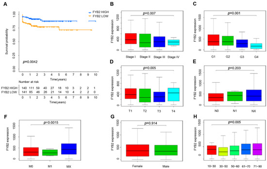 We further divided the patients, taking the median as the cutoff value, into two groups with low and high FYB2 levels. Survival prognosis for FYB2 was analyzed through batch survival analysis carried out with R. High expression of FYB2 is positively related to good survival outcomes, and the group with the low expression level of FYB2 has a significantly inferior prognosis compared with that of high expression (p = 0.0042) (Figure 3A). Furthermore, we examined the FYB2 expression in different cancer stages. We found that reduced expression of FYB2 was associated with the disease severity (p = 0.007) (Figure 3B). Significant differences were observed in AJCC-T stages (p = 0.005) (Figure 3D) and AJCC-M stages(p = 0.015) (Figure 3F), but significant differences were not observed in the associations of tumor grade (Figure 3C), AJCC-N stages (Figure 3E), gender (Figure 3G), and clinical variables of age (Figure 3H).
