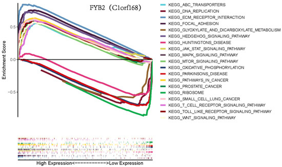 We conducted gene set enrichment analysis (GSEA) to discover the signaling pathways related to high and low expression of FYB2 in LIHC (Figure 5). The results showed that genes involved in DNA replication, glyoxylate and dicarboxylate metabolism, hedgehog signaling pathway, Huntington’s disease, oxidative phosphorylation, Parkinson’s disease, and ribosome were enriched in the FYB2 low expression group. These results suggested that the downregulation of FYB2 was associated with a variety of cellular metabolism-related pathways as described above, as well as with diseases, and in particular with the regulation of cancer-related pathways.