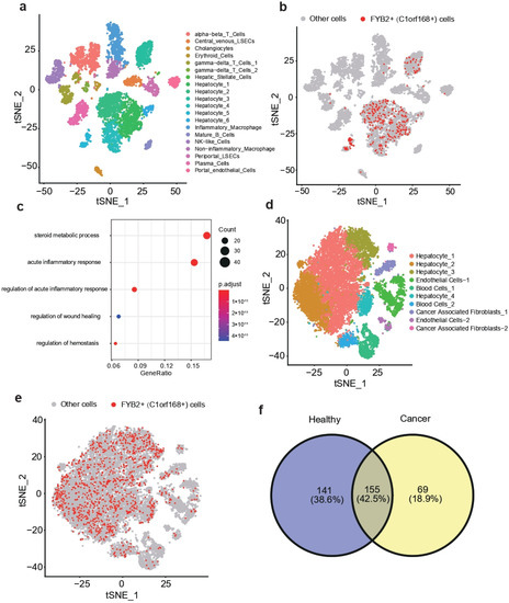 t-SNE visualization of combined datasets from GSE115469 (a). t-SNE visualization of FYB2+ cells (b). Go enrichment analysis of upregulated genes of FYB2+ cells (c). t-SNE visualization of combined datasets from GSE112271 (d). t-SNE visualization of FYB2+ cells (e). Venn diagram showed the intersection of highly expressed genes of FYB2+ cells between healthy cancer and liver cancer (f).