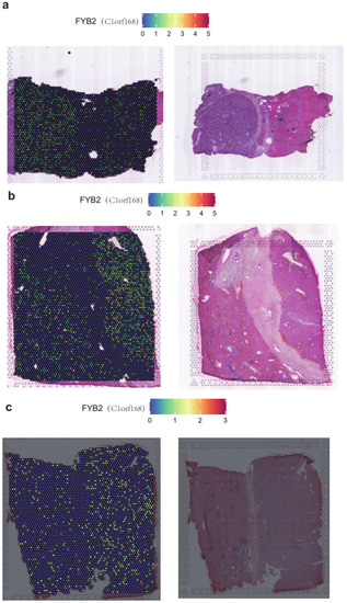Spatial transcriptomics allows visualization and quantitative analysis of the transcriptome with spatial resolution in individual tissue sections. We used the spatial transcriptome datasets from the HRA database to investigate the distribution characteristics of FYB2 in tumor and non-tumor regions on a spatial basis. After evaluating three samples obtained from the area between the tumor and the adjacent tissue in the liver, in terms of visualization and quantitative analysis, we determined that FYB2 expression in the adjacent area was higher than that in the tumor area (Figure 7a–c).