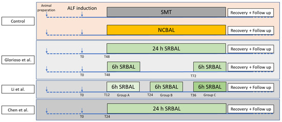 Design of all studies including the timepoint of ALF induction, the start and duration of the SRBAL treatment and the reprehensive control groups (SMT and NCBAL) [29,32,33].