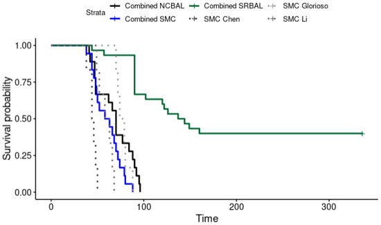 Kaplan–Meier survival curve of all three investigated treatment options (SMT: standard medical therapy, NCBAL: SRBAL with no cells in the reservoir, SRBAL: Mayo Spheroid Reservoir Bioartificial Liver) in comparison to the expected survival curve of each individual model. Each curve represents the cumulative survival rate of all three included original article (Glorioso et al. [32] Li et al. [33] Chen at al. [29]) in consideration of the individual treatment regime and the expected survival rate of each individual ALF model.