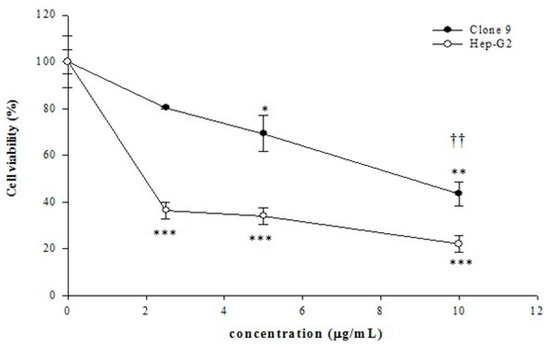 Cytotoxic effects of tagitinin C at various concentrations on Clone 9 (normal) and Huh 7 (hepatoma) cells. The data represent the mean ± standard deviation of three independent experiments. (* p < 0.05 vs. control, ** p < 0.01 vs. control, *** p < 0.001 vs. control, †† p < 0.01 Clone 9 vs. Huh 7 cells).