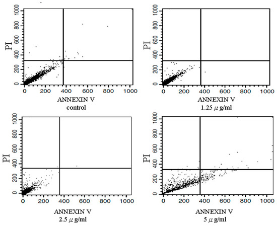 Results of flow cytometric analyses. Effects of tagitinin C on apoptosis in a hepatoma cell line. Huh 7 cells (8 × 105 cells/mL), treated with or without tagitinin C for 24 h, were harvested and fixed with 1 mL of ice-cold 70% ethanol at 4 °C for 2 h. Annexin V is a phospholipid-binding protein that has affinity for phosphatidylserine (PS) and is used to analyze apoptotic activity. Test cells were stained using an Annexin V-FITC assay kit (Dojindo, FoliBio Technology Co., Ltd., Taipei, Taiwan) for 15 min and then treated with propidium iodide (PI) for 30 min in the dark. The apoptotic cell distribution was analyzed by fluorescence-activated cell sorting flow cytometry (BD FACSCalibur™ Flow Cytometer; BD Biosciences).