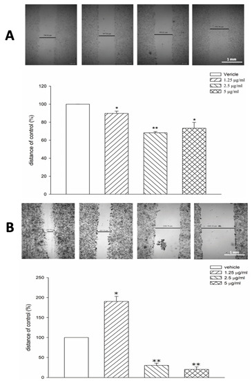 Tagitinin C inhibits cell migration of Hep-G2 and Huh 7 cells. (A) Scratch migration assay of Hep-G2 cells (control or tagitinin C-treated cells). (B) Scratch migration assay of Huh 7 cells (control or tagitinin C-treated cells). * p < 0.05 vs. control, ** p < 0.01 vs. control.