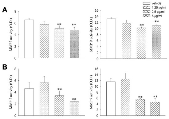 Tagitinin C significantly reduced the cell migration of Hep-G2 (p < 0.05; Figure 3A) and Huh 7 (p < 0.05; Figure 3B) cells. Moreover, tagitinin C significantly inhibited MMP2 and MMP9 activity, suggesting that it may exhibit an anti-metastatic effect via MMP2 and MMP9 (Figure 4).