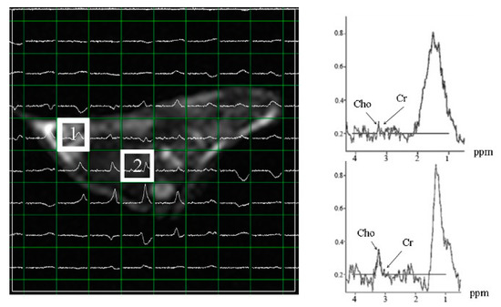 Multi-voxel spectra of hepatoma in subcutaneous Hep-G2-xenografted mice after 25 days of inoculation. Voxel 1 shows the inoculation point of Hep-G2. Voxel 2 shows the maximum choline levels, indicating that Hep-G2 cells migrated from voxel 1 to voxel 2. Cho: choline; Cr: creatine.