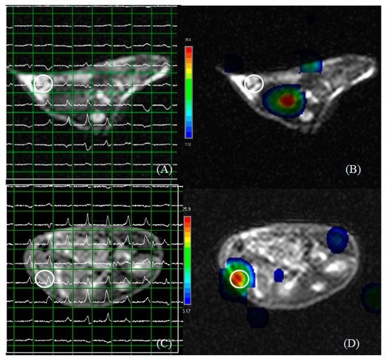 Multi voxel spectra of hepatoma in subcutaneous Hep-G2- (A,B) and Huh 7- (C,D) xenografted mice at 25 days post-inoculation. (A) The choline/creatine level at the inoculated point in (B). (C) The choline/creatine level at the inoculation point in (D). The maximum choline/creatine level was detected at some distance from the inoculation point in Hep-G2-xenografted mice. The maximum choline/creatine level was near the inoculation point in Huh 7-xenografted mice. Circles indicate the point of inoculation.