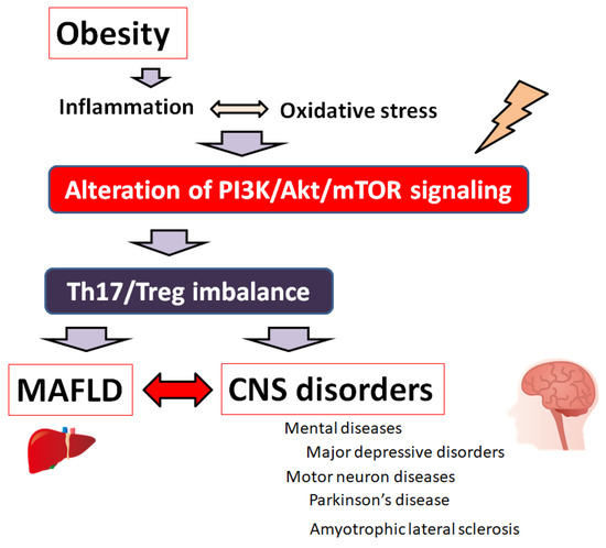 A hypothetical schematic representation and overview of the pathogenesis of MAFLD and various brain disorders including mental diseases and/or motor neuron diseases. Obesity, inflammation, and/or oxidative stress could lead to the alteration of PI3K/AKT/mTOR signaling following contribution to the imbalance of Th17/Treg ratio of immune cells, which might eventually lead to the pathogenesis both of MAFLD and brain disorders. Note that several significant things have been omitted for clarity.