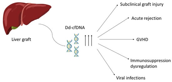 - Viral infection:Transplant recipients require lifelong immunosuppression and are at high risk of developing various opportunistic infections, such as EBV/CMV. This stresses the need for a non-invasive biomarker in order to investigate the possibility of viral infection in LT recipients. Dong Zhao et al. investigated the role of dd-cfDNA as a possible diagnostic method of the viral infection of the liver. In the results of their research, the authors mention that patients with EBV or CMV had a significantly higher dd-cfDNA fraction (%) and absolute quantification median dd-cfDNA (cp/mL); notably, the levels of dd-cfDNA were higher in EBV patients than those with CMV [14]. Moreover, Ekkehard Schuetz et al. investigated the possible diagnostic role of GcfDNA in LT recipients infected with HCV. In their results, it was determined that there is a slightly higher and more variable GcfDNA percentage in HCV+ patients than in those in a stable condition [13]. Oellerich, M et al. also show significantly elevated GcfDNA in HCV+ LT recipients in their results [17].