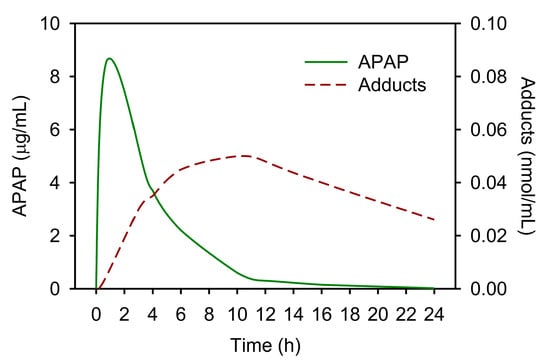 Relative kinetics of APAP and APAP-protein adducts. Simulated data for non-hepatotoxic APAP doses. Derived from publications [65,81,82,83,84,85] and from known half-lives. With liver injury, longer half-lives for both analytes are expected, with the APAP-protein adducts’ half-life still exceeding that of APAP.
