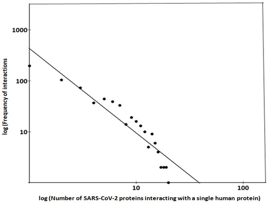 Figure 3 shows the distribution graph of the entire set of human liver proteins (626 proteins) interacting with viral proteins (see also EXCEL FILE S3). Each point on the curve reports the set of human proteins that have the same number of interacting viral proteins. The fit shows that the distribution conforms to a power law, albeit with an R2 value of 0.5278, suggesting an acceptable fit. This value is at the low limits of reliability and may imply existing heterogeneities in the distribution, which makes the results difficult to explain. This should not be surprising because the distribution reflects the overall structural and functional behavior of the entire set of human proteins with different roles from each other and subjected to sequential functional stress by viral proteins in complex and metabolically differentiated cellular environments. Hundreds of interactions are one-to-one (those on the left side of the curve), while others involve multiple interactions (multi-to-one), to up to 20 viral proteins per single human protein (in the tail). The connectivity distribution in Figure 3 is quite consistent with the power law’s prediction of preferential attachment [102]. Thus, our model should show the emergence of a scale-free topology [103] from interaction results. So, if the connectivity distribution follows a power law, then new nodes will have a better chance of connecting to those with already many neighbors because of the preferential attachment rule.