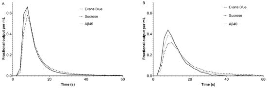 Representative dose-normalized outflow curves for Aβ40, sucrose and Evans Blue from MID experiments in perfused rat livers from young (A) (n = 6) and old (B) rats (n = 10).