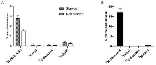 Uptake of radiolabelled molecules by (A) FCS-starved and non-starved primary mouse hepatocytes and (B) primary mouse liver sinusoidal endothelial cells. Results are normalized per 100,000 cells for hepatocytes and per 250,000 cells for LSEC. Cells from a total of three mice shown.