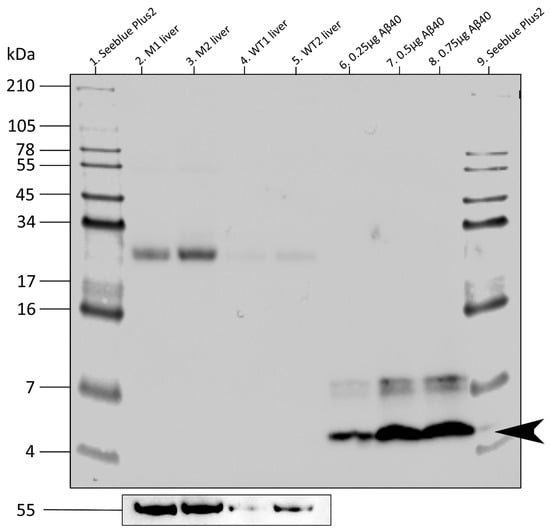 Western blots were performed on the total protein extracted from livers of mice injected with Aβ40 via an IVC injection and untreated C57BL/6J liver tissue, along with raw samples of 3H-Aβ40 and unlabelled Aβ40 standard. Liver tissue was lysed using a polytron homogenizer (PT1200E, Kinematica, Malters, Switzerland) with total protein extracted as previously described []. Moreover, 20 µg of extracted protein was loaded onto 16% tricine gels and electrophoresed for 110 min at 120 V to enable the separation of monomeric Aβ protein (4 kDa). After a 7 min rapid transfer to a PVDF membrane, the membrane was blocked in skim milk for 1 h and then incubated overnight at 4 °C with a primary antibody to human Aβ1−16 (BioLegend). This was followed by incubation with an anti-mouse secondary antibody for 1 h and membrane development using ECL-Plus chemiluminescence detection solution. The membrane was subsequently re-stained with an anti-α-tubulin antibody (Sigma) to visualize differences in protein loading. Images of the PVDF membrane were recorded using a ChemiDoc MP (Bio-Rad, Hercules, CA, USA).