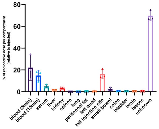 Furthermore, 3 male C57Bl6 mice were each injected via the tail vein with 100 µL of dialysed 3H-Aβ40. Moreover, 10 µL of 3H-Aβ40 was also placed into 5 mL of scintillation fluid at the same time as each injection to determine the total amount of radiation injected. Additionally, 10 µL of blood was collected via a tail snip at 5 and 15 min after each injection and placed into 10 mL of scintillation fluid. After 30 min, blood was collected from each mouse via cardiac puncture along with weighed samples of liver, kidney, spleen, lung, peritoneal fat, left quadricep, tail (injection site), small bowel, colon, the 1st pellet of faeces from the colon, bladder, and brain. Tissue samples were placed in 1 mL of Solvable (Perkin Elmer, Sydney, Australia) and incubated in shaker for 4 h at 60 °C. Then, 200 µL or 400 µL of hydrogen peroxide from Merck (cat. no. 18312, Bayswater, Australia) was added. Samples were then left to settle at room temperature for 1 h. Then, 10 mL of scintillation fluid was added, and each sample was analysed for 3H-specific radioactivity counts by a Tri-Carb T4910TR liquid scintillation analyser (Perkin Elmer, Sydney, Australia). Tritium counts were normalised to control counts from matched samples of untreated mice.