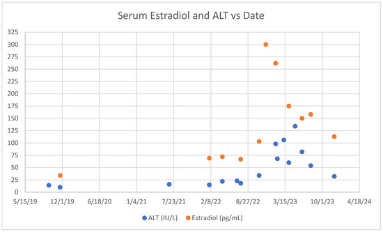 A previously healthy 28-year-old transgender woman was referred to hepatology by endocrinology for new onset ALT and AST elevations (ALT 98, AST 38) from previously normal levels. Repeat labs showed the following markers: ALT of 68, AST of 32, alkaline phosphatase of 73, gamma-glutamyl transferase of 9, total bilirubin of 0.5, albumin of 4.9, and international normalized ratio of 1.1. Her review of systems was notable for constipation, abdominal pain, and rectal bleeding. She had also undergone a negative workup with cardiology for dizziness and chest pressure. Her medical history was remarkable given the initiation of estrogen in 2019 with a drug holiday and the resumption of consistent estrogen administration in 2021. Serial monitoring of serum estradiol levels and liver enzymes was conducted while the patient was receiving hormone therapy (Figure 1).