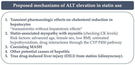 The key consideration when caring for chronic liver patients who are being treated with statins is to measure liver enzymes before initiating statin therapy. Baseline liver enzyme levels provide critical information about the patient’s underlying liver function. It is crucial to understand that an increase in ALT during statin treatment should not be automatically interpreted as a sign of ongoing liver disease or injury. Instead, it may be indicative of a condition known as “transaminitis”, where liver enzymes leak without causing hepatotoxic effects in the absence of proven hepatotoxicity. This class effect is typically asymptomatic, reversible, and dose-related [71]. This concept of “transaminitis” may explain many of the observed ALT elevations in patients taking statins. The most common occurrence is a transient increase in ALT levels, which is typically asymptomatic and often observed within the initial 12 weeks of statin therapy (range 5–90 days) [72,73]. Several potential mechanisms of ALT elevation in statin use have been proposed in Figure 2. ALT is considered a more reliable indicator of potential hepatotoxicity compared to aspartate aminotransferase (AST), as elevated AST levels can also result from muscle injury. Additionally, elevated ALT levels should be confirmed through repeated measurements, as a single elevation is more suggestive of “transaminitis” rather than liver damage. Furthermore, clinicians should differentiate transient ALT elevations caused by statins from those due to underlying liver disease. It has been hypothesized that the lipid-lowering effect of statins might impact the structure of cellular membranes which are composed of phospholipid, leading to increased leakage of cellular enzymes. However, routine monitoring is not necessary in the absence of clinical signs or symptoms suggesting possible hepatotoxicity [74].