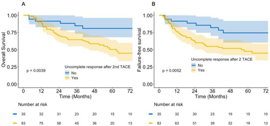 Figure 1. Kaplan–Meier survival curves after second TACE. (A) overall survival after 2nd TACE; (B) failure-free survival after 2nd TACE.