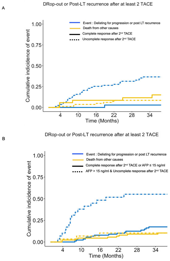 Figure 2. Cumulative incidence of failure after second TACE. (A) Cumulative incidence of failure after second TACE according to the radiological response (complete or incomplete radiological response after second TACE); (B) Cumulative incidence of failure after second TACE according to the presence of both AFP > 15 ng/mL and uncomplete response after second TACE or the presence of just one of these unfavorable characteristics.