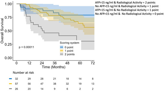 We derived a simple scoring system, attributing one point for each present factor (AFP > 15 ng/mL before the first TACE and lack of complete response on imaging after the 2nd TACE), to better understand the clinical significance of the Cox model. The observed survival according to each patient group (0 points, n = 32; 1 point, n = 57; 2 points, n = 26), shown in Figure 3, indicates that patients in the 2-point group have poor outcomes after the second TACE and provide early identification of a high-risk subgroup on the waiting list.