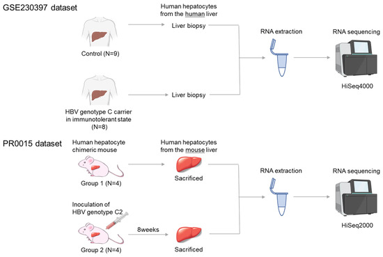 Gene expression profiles obtained from a previous study were used in this study [9]. Briefly, serum samples were obtained with written consent from HBV carriers, and high-viremia HBV genotype C serum (HBV DNA 7.8 log copies/mL) was used to infect mice. The HBV clone sequence was registered in NCBI (Accession: MH891502). The study followed the Declaration of Helsinki and was approved by the Hiroshima University Ethical Committee (Approval ID: E2015-0103). The experimental scheme is shown in Figure 1.