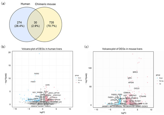 Identification of differentially expressed genes (DEGs) with HBV infection. (a) Venn diagrams indicate the overlap in DEGs between human and chimeric mice. (b) The volcano plot depicts the distribution of DEGs in the GSE230397 clinical dataset. (c) The volcano plot shows DEGs in the PR0015 mouse dataset. The red color represents upregulated genes, while the blue color represents downregulated genes.