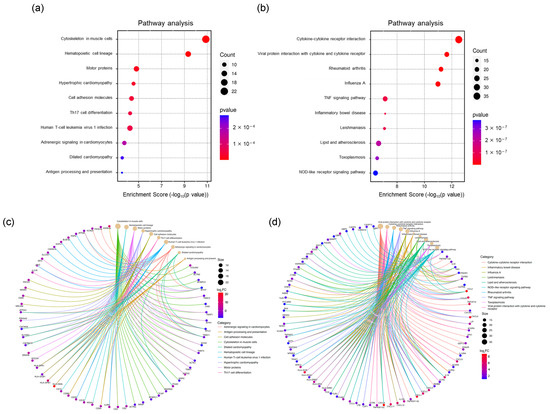 KEGG analysis of DEGs. (a) Top 10 significantly enriched pathways of DEGs in the GSE230397 dataset. (b) Top 10 significantly enriched pathways of DEGs in PR0015. (c) Significant genes involved in the top 10 pathways in GSE230397. (d) Significant genes involved in the top 10 pathways in PR0015.