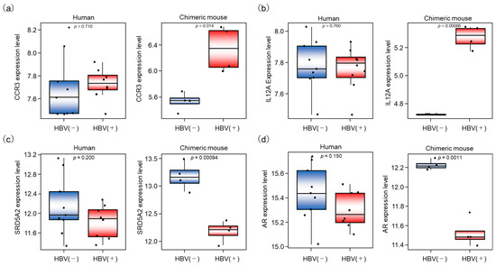 To further assess these differences, we compared the expression of each gene in the clinical and chimeric mouse samples. Although CCR3 and IL12A were not significantly different in the clinical samples, both genes were significantly upregulated in the chimeric mouse livers following HBV infection (Table 1 and Figure 6b). On the other hand, the genes SRDSA2 and AR, which negatively regulate IL12A transcription, were downregulated in the chimeric mouse livers following HBV infection but were not altered in the clinical samples (Figure 6c,d).