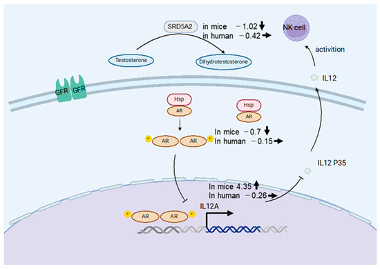 IL12A, a member of the IL12 family, plays an important role in eradicating tumor cells and virus-infected cells via activation of NK cells and cytotoxic T cells [21]. To identify the mechanism of IL12A regulation, we searched the hTFtarget database for upstream regulatory factors. The transcription factors AR and Steroid 5-alpha-reductase type 2 (SRD5A2) were identified as regulators of IL12A transcription. Previous studies have shown that AR suppresses IL12A expression by directly binding to its promoter region, thereby inhibiting NK cell cytotoxicity against HCC [22] (Figure 7). As shown in Figure 6b,d, IL12A was significantly upregulated in the chimeric mouse livers by HBV infection, while AR was negatively regulated. On the contrary, IL12A expression was not altered in HBV-infected human livers relative to livers from healthy volunteers. These results indicate that immune tolerance to HBV was induced not only in immune cells but also in human hepatocytes in asymptomatic HBV carriers, whereas human hepatocytes in chimeric mouse livers are not in an immune-tolerant state and may react to eradicate HBV from hepatocytes. Furthermore, when we searched for upstream regulators of AR, we found that SRD5A2 may positively regulate AR expression. SRD5A2 is a crucial enzyme in androgen metabolism, converting testosterone into the more potent dihydrotestosterone (DHT) [22,23]. In the present study, SRD5A2 expression was downregulated by HBV infection in the chimeric mouse livers, resulting in the downregulation of AR expression.