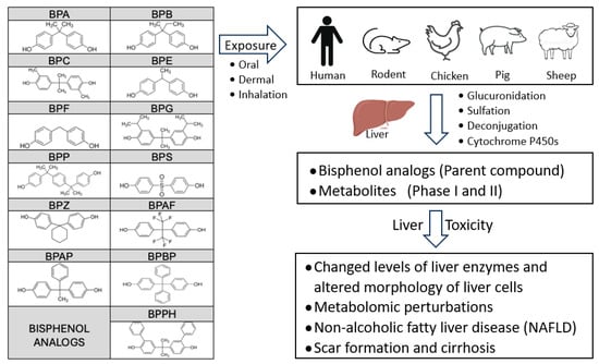 BPA is the most studied bisphenol analog regarding its adverse effects on many organ systems, including the liver [11,12]. It has been reported that BPA can be detected in human fetal livers as early as the 3rd month of life [13], suggesting potential developmental toxicity. Aside from BPA, other bisphenol analogs are currently not regulated, largely because fewer studies have examined their potential toxicities. We have previously reviewed the toxicities of several bisphenol analogs, e.g., BPS and BPF, on the reproductive, nervous and immune systems [4]. However, the liver is the organ of first-pass metabolism to metabolize and detoxify toxic chemicals/metabolites to protect organisms from potentially toxic insults. The liver comprises approximately 2% of body weight in an adult human, and about 25% of the total cardiac output passes through the liver. It is the first organ that encounters blood from the gastrointestinal tract [14]. Due to the close association of the estrogen signaling pathway with lipid metabolism, the liver represents a major site for the generation and action of toxic metabolites following exposure to bisphenol analogs and the manifestation of acute and chronic adverse effects. However, toxicological information regarding other bisphenol analogs on the liver has not been systemically reviewed. Because of their different metabolic processes, it is possible that bisphenol analogs employ different mechanisms from that of BPA to produce their toxic effects on the liver. Thus, we conducted a comprehensive review of the current literature that describes the liver toxicity of bisphenol analogs and their related mechanisms in various species, including human, rodent, chicken, pig and sheep (Figure 1).