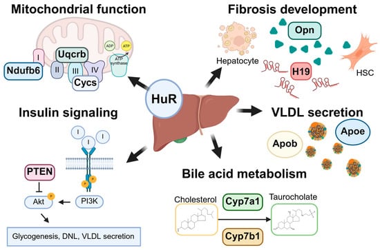 Graphical summary of HuR’s roles in liver homeostasis and MASLD pathogenesis. HuR plays a multifaceted role in maintaining hepatic homeostasis and regulating key processes implicated in MASLD development. These include electron transport chain activity and mitochondrial function, hepatic stellate cell (HSC) activation and fibrogenesis, insulin signaling via the phosphoinositide 3-kinase (PI3K)/AKT serine/threonine kinase 1 (AKT1) pathway, lipoprotein assembly and VLDL secretion, and bile acid synthesis and metabolism. HuR directly or indirectly regulates the expression of a wide array of target transcripts involved in these pathways, including NADH ubiquinone oxidoreductase subunit B6 (Ndufb6), ubiquinol–cytochrome c reductase binding protein (Uqcrb), cytochrome C (Cytc), osteopontin (Opn), H19, phosphatase and tensin homolog (Pten), apolipoprotein b (Apob), apolipoprotein e (Apoe), cytochrome P450 family 7 subfamily A member 1 (Cyp7a1), and cytochrome P450 family 7 subfamily B member 1 (Cyp7b1). Collectively, these regulatory activities position HuR as a key post-transcriptional mediator in both physiological liver function and MASLD progression. Created in BioRender V2. https://BioRender.com/qshr340. (accessed on 1 July 2025).