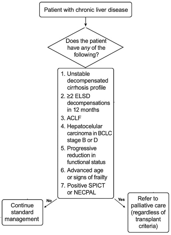 We recognize that clinical trajectory of ESLD is unpredictable, often characterized by episodic decompensations. This fluctuating course complicates timely prognostication and the initiation of goals-of-care discussions. However, referrals to palliative care should be based on patient needs rather than on prognosis. Also, misconceptions about the role of palliative care among clinicians and patients can serve as barriers. It is imperative to reframe the role of palliative care within the healthcare system: it should not be viewed as a sign of therapeutic failure but as an essential component of comprehensive care for patients with liver cirrhosis and other serious illnesses. Timely and adequate referrals to palliative care should be recognized as hallmark of quality of care. Based on the data found, and adapting the model proposed by HepatoCare and Mazzarelli et al., we propose that referral to palliative care should be considered in at least 7 situations, described in Figure 1 [47,92].