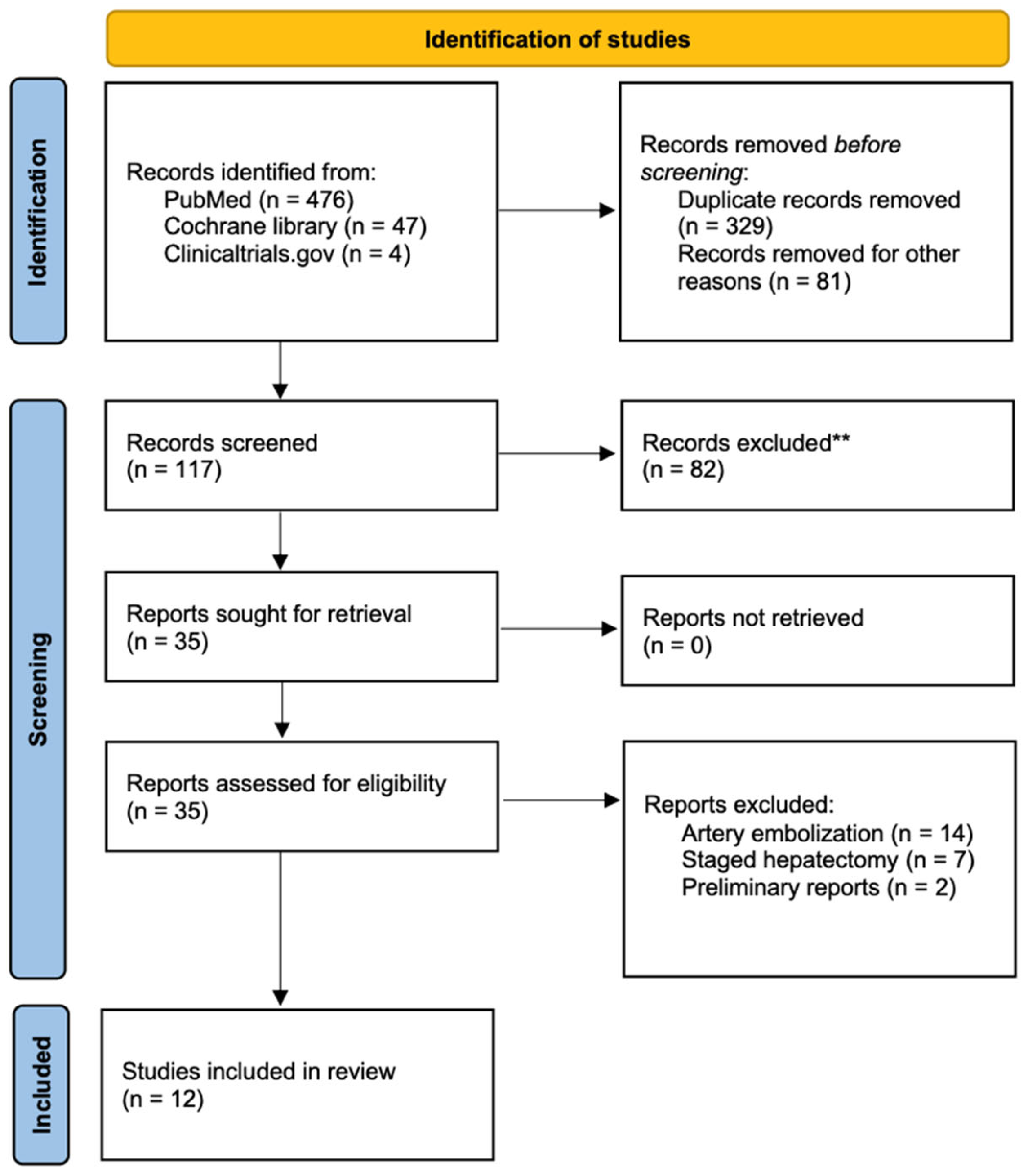 - Li, W.; Li, H.; Kong, Q.; Teng, F.; Chen, Z. Preoperative Hepatic Augmentation Versus Transarterial Chemoembolization for Hepatocellular Carcinoma with Insufficient Remnant Liver Volume: A Systematic Review and Meta-Analysis. Cancer Med. 2025, 14, e71050. [Google Scholar] [CrossRef]